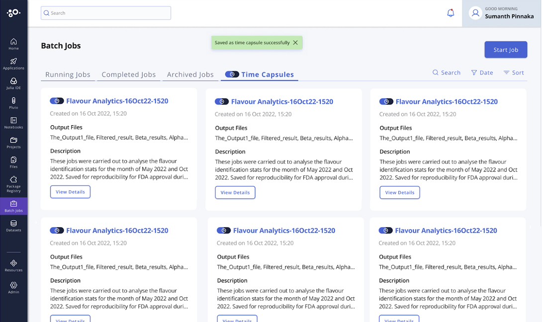 Time Capsule allows users to reproduce batch jobs. It automatically captures, archives, and preserves every input, output, and environmental variable from jobs, allowing organizations to reproduce, audit, and re-run scientific workflows exactly as originally executed—even years later—for compliance and reproducibility needs.